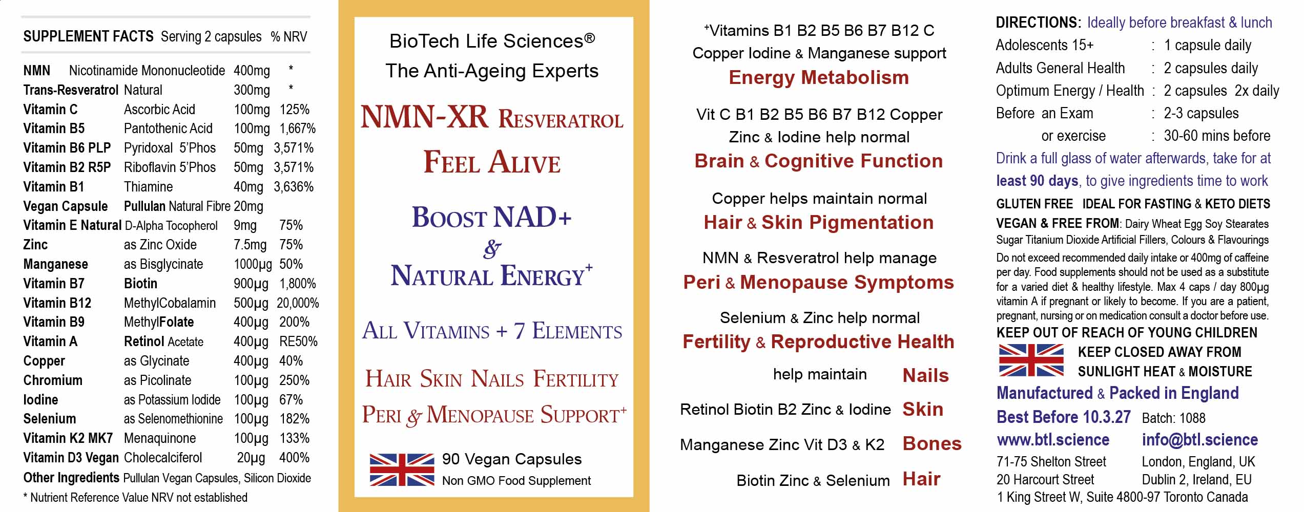 BioTech Life Sciences | NMN-XR Resveratrol Vitamins Anti-Ageing Hair Skin Menopause | 90 capsule