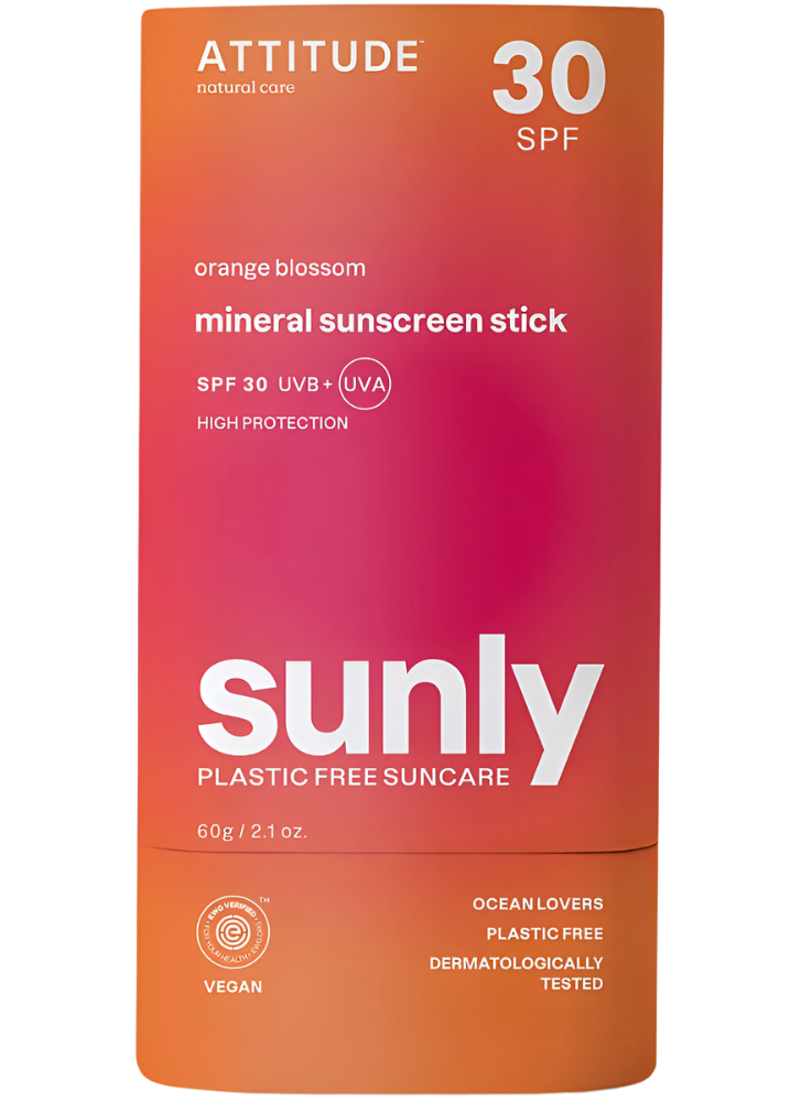 Protect your skin with Sunly. ATTITUDE SPF 30 sunscreen stick is formulated with non-nano zinc oxide to limit our impact on coral reefs. This mineral filter provides broad spectrum protection against UVA and UVB rays. Indulge in fresh summer memories with its delightful orange blossom aroma. Practical and environmentally friendly, it comes in a biodegradable cardboard tube and applies easily without leaving white traces. Its EWG VERIFIED, vegan and dermatologically tested formula lets you enjoy your vacation outdoors with peace of mind!