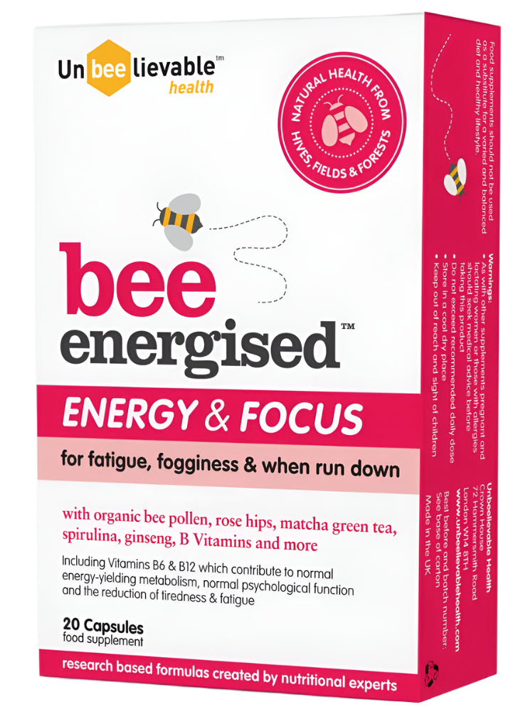 Multi award winning Bee energised is an all in one synergistic formula which is researched and formulated by nutritionists combining highest quality nutrients shown to help improve energy focus including organic: bee pollen, matcha tea, green tea leaf and spirulina along with siberian ginseng, rosemary extract rose hips along with Vitamin B6 Vitamin B12 (which contribute to normal energy yielding metabolism- reducing feelings of tiredness and fatigue), providing support to help maintain a steady stream of energy, stamina, concentration levels and mental alertness throughout the day, without the jitters and crashes. Benefits build with time to help resolve ongoing issues of fatigue lethargy. The highly beneficial plant based ingredients are not usually found in a regular diet or multivitamin and complement any health regime. Capsules may be opened into yogurt, juice or smoothies