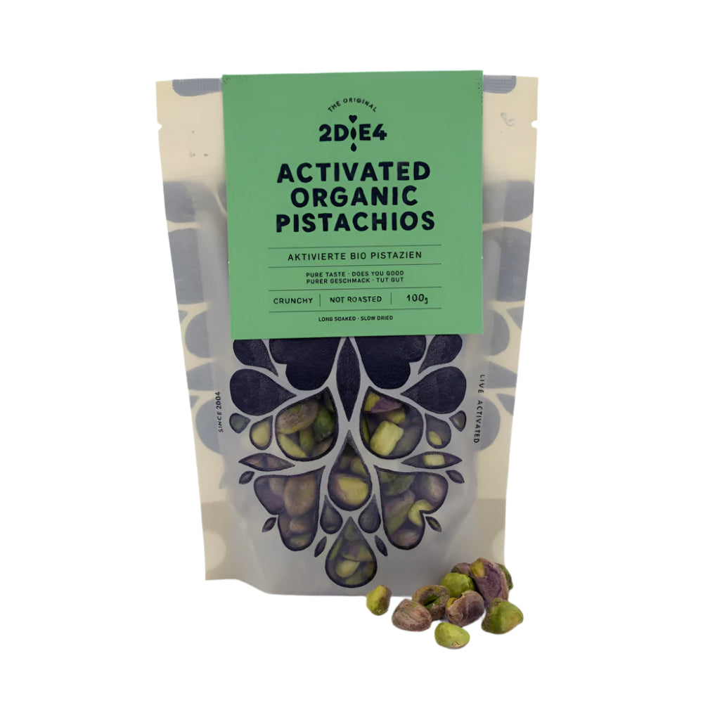 2DiE4 Activated Organic Pistachios Activated, not roasted! Long soaked, slow dried at temperatures below 65C Pure and all natural The tastiest, crunchiest, and most wholesome nuts! A delicacy for foodies, vegans, athletes and any conscious people Harvested in the Extremadura - Spain Handcrafted on the foothills of the Bavarian Alps The original since 2004