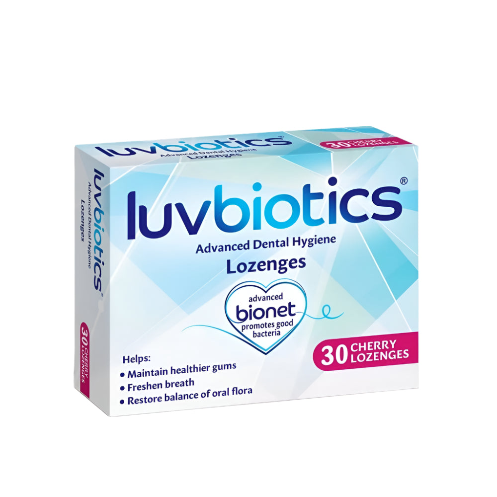Luvbiotics Lozenges with Probiotics Xylitol and Aloe Vera Promotes Good Bacteria for Fresh Breath, Healthy Gums and Cavity Protection. Helps heal Mouth ulcers Oral Thrush. Cherry Mint Pack of 30 Product Description Luvbiotics Cherry lozenges uses bio net technology powered by probiotics and xylitol with natural ingredients, to promote good bacteria and balance oral flora for a happier, healthier mouth. Free from SLS, parabens, artificial colours and preservatives. Ingredients Sweeteners (isomalt and xylitol), Natural mint aroma, Anti caking agent (magnesium stearate), Lactobacillus reuteri (milk), Aloe Vera gel