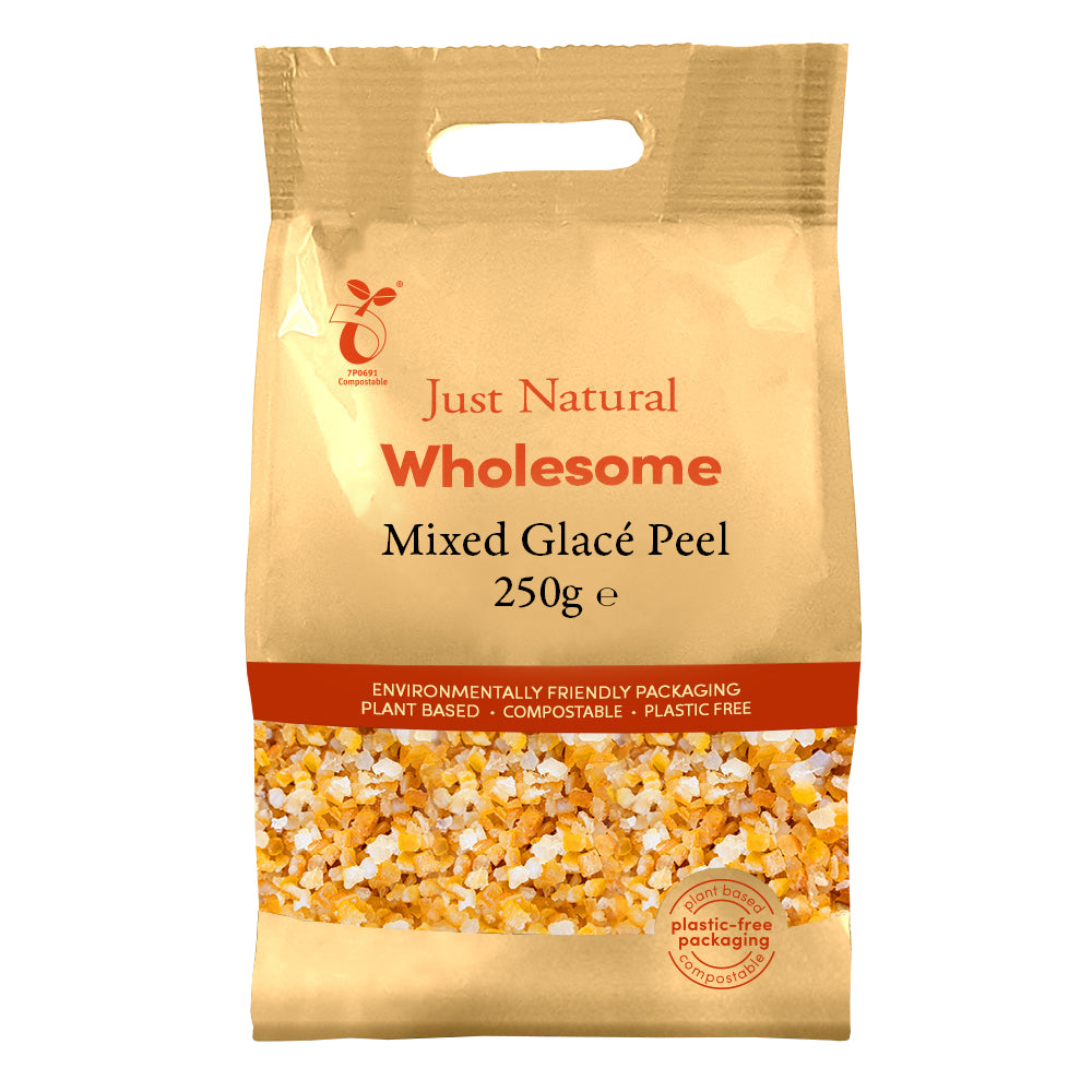 Just Natural Mixed Glace Peel is sourced from the best producers around the world. Diced orange and lemon peel from mature fruit is coated in syrup and crystalised to give a delicious citrussy inclusion for bakes and desserts. And it's packed in our 100% plastic free, certified home compostable packaging. For nutritional information and ingredients, click Further Information.