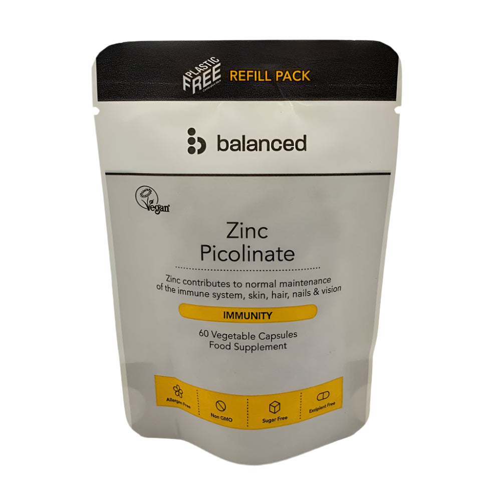 Balanced Zinc Picolinate 60 Veggie Caps in our 100% recyclable paper refill pouch. Vegan and free from excipients, soy, GMO, gluten, lactose and sugar. Zinc contributes to the normal maintenance of the immune system, skin, hair, nails vision. Also available in our re-useable glass bottle (BAL11).