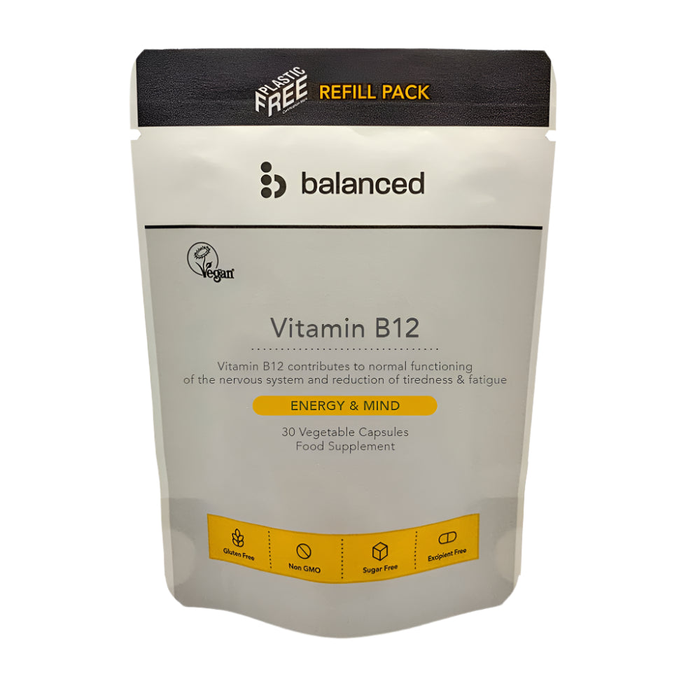 Balanced Vitamin B12 30 Veggie Caps in our 100% recyclable paper refill pouch. Vitamin B12 contributes to normal functioning of the nervous system and reduction of tiredness fatigue. Vegan and free from excipients, soy, GMO, gluten, lactose and sugar. For nutritional information and ingredients, click Further Information.