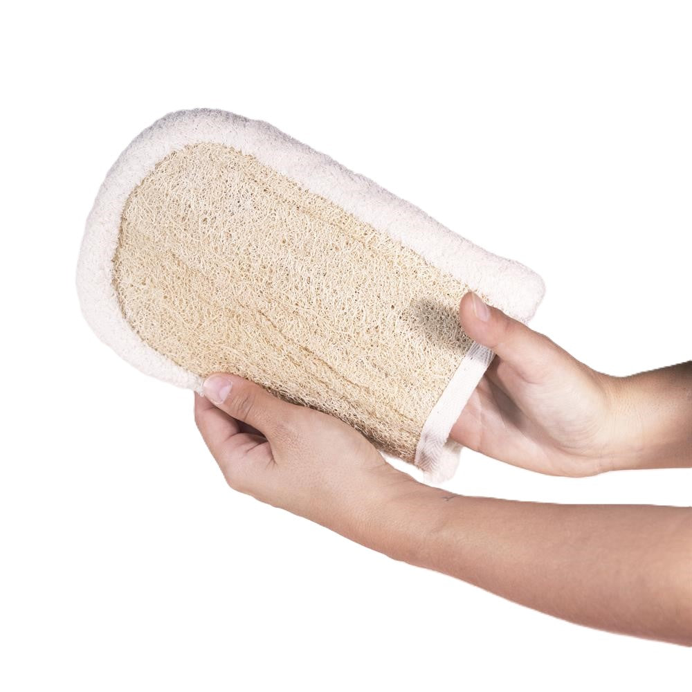 Double Sided High Quality Loofah Glove One side in natural loofah leaves your skin invigorated and more receptive to sunscreen application. ?The other soft side is perfect to remove the sunscreen after a day under the sun. The material are natural and biodegradable Loofah origin is Egypt; cotton origin is Turkey Packaged in home compostable carton