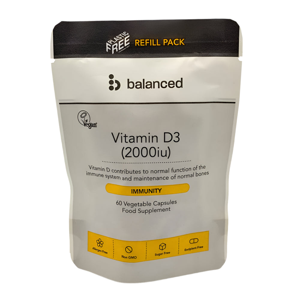 Balanced Vitamin D3 60 Veggie Caps in our 100% recyclable paper refill pouch. Vegan and free from excipients, soy, GMO, gluten, lactose and sugar. Vitamin D contributes to normal function of the immune system and maintenance of normal bones. Also available in our re-useable glass bottle (BAL13).