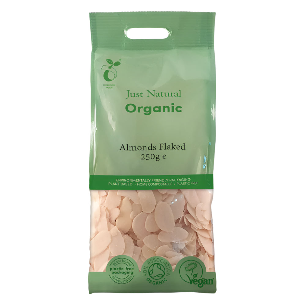 Just Natural Organic Flaked Almonds are selected from only the best organic producers from around the world. A high protein addition to any baking recipe, or your favourite muesli. And they're packed in our 100% plastic free compostable packaging.