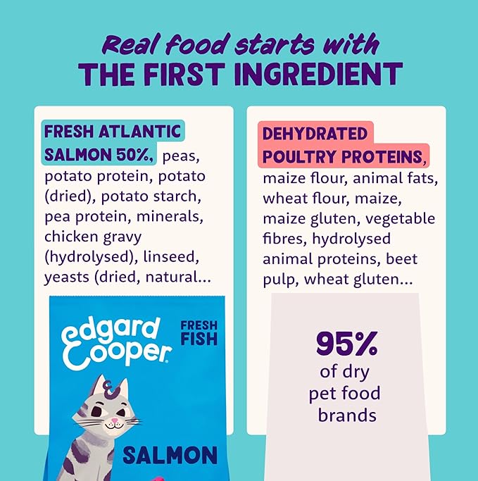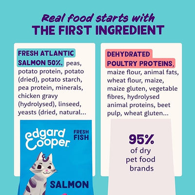 Natural dry cat food, packed with fresh salmon, Suitable for all adult neutered or nonsterilized cats of all breeds and sizes. Grain free, perfect for sensitive stomachs with prebiotics for healthy intestines, Natural source of , lean protein that supports immune health, strong bones and muscles, Feel good about the food you’re serving, no over processed or dried meat, Switch to Edgard Cooper by gradually increasing the amount of the new food while decreasing the old brand over 10 days