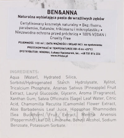 Ben Anna whitening toothpaste with fluoride, a powerhouse in the fight against discoloration. Formulated with sage, vitamin A and antioxidants to protect and shield against tooth decay and free radicals.