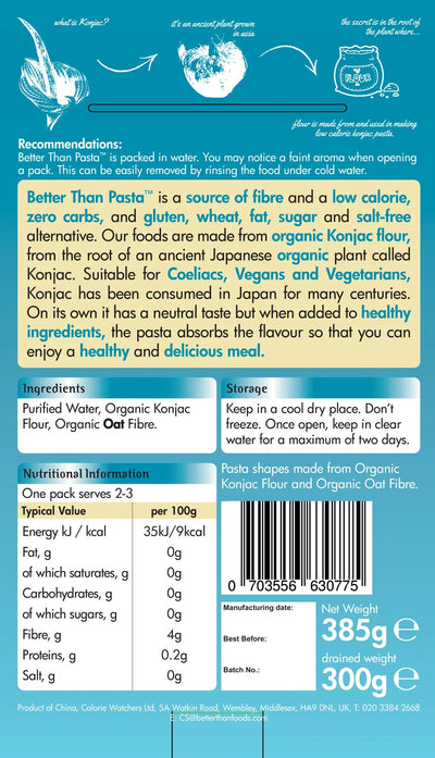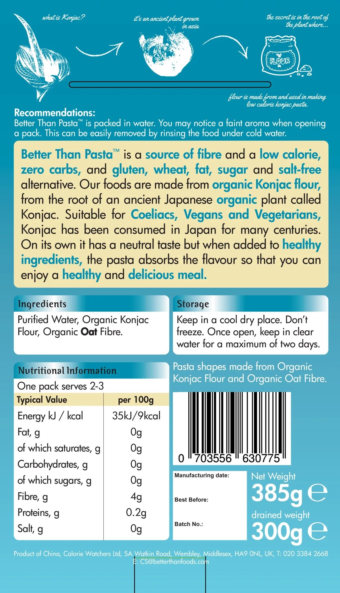 Better Than Pasta Tagliatelle is made from Organic Konjac flour. It is a gluten and dairy free alternative to regular tagliatelle. It contains only 9 calories and 0g of carbohydrates (per 100g serving). It is made from Juroat, a special blend of Organic Konjac flour and Organic oat fibre. Better Than Pasta looks a lot like traditional tagliatelle compared to other traditional Konjac tagliatelle shapes. Suitable for Organic diets, Coeliacs, Diabetics, Vegans and Vegetarians. Each pack serves 2-3. 385g (300g drained weight)