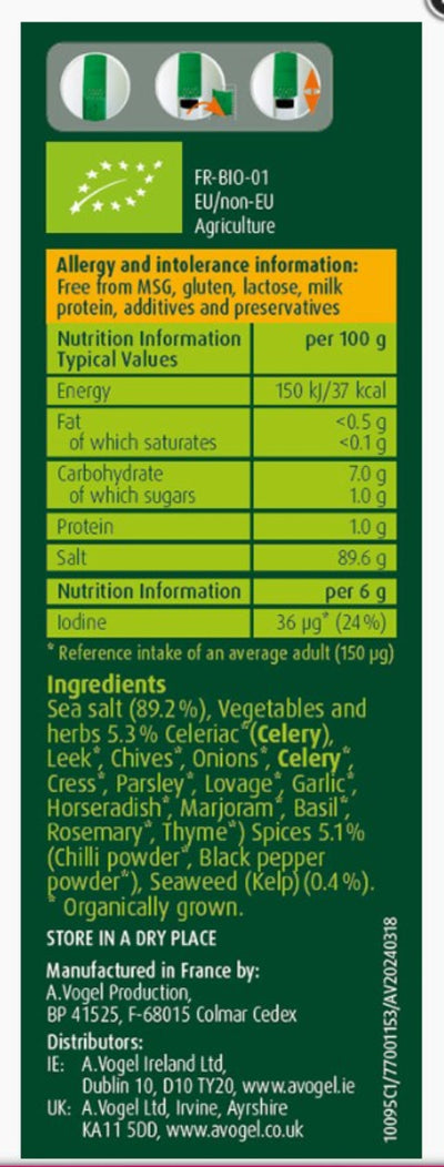 A combination of organic herbs, vegetables, spices and sea salt, used to add flavour in cooking or as a spicy table salt.
