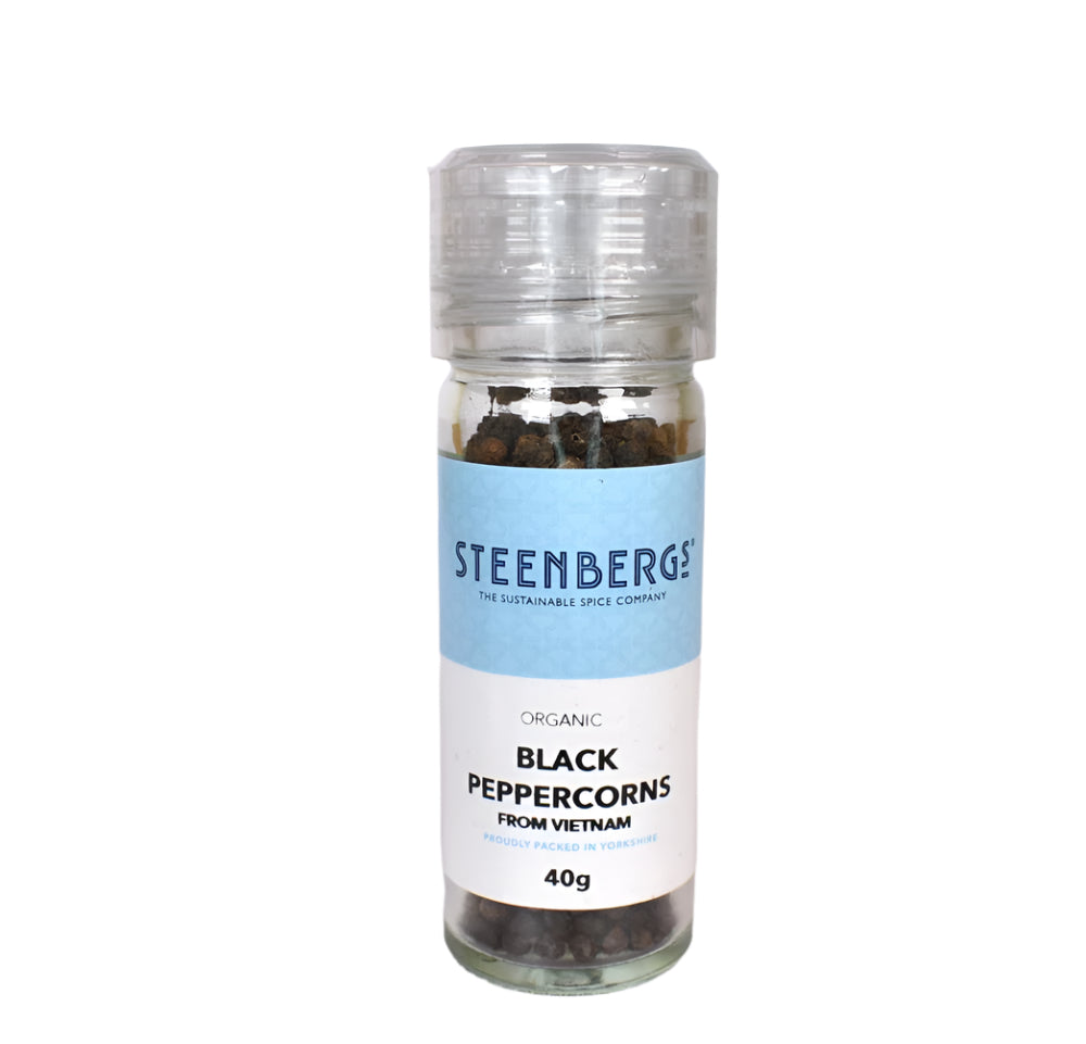 Storecupboard essential - Organic Black Peppercorns from Steenbergs in grinder top jar. Freshly grind each time.