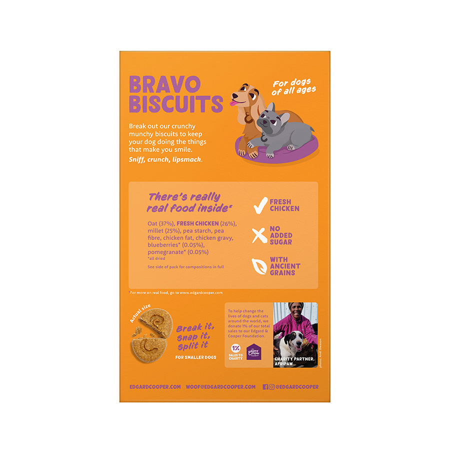 "Break out our crunchy Bravo Biscuits when the best behaviour deserves something to drool over. Whether it's for waiting patiently, avoiding muddy paws, or ignoring the doorbell-these are the moments you've learned together. Perfect for dogs of all ages and packed with fresh, tasty chicken, along with a cracking crunch. No artificial flavours and no added sugar-just pure lipsmacking goodness. Munch, crunch, mouthwater."