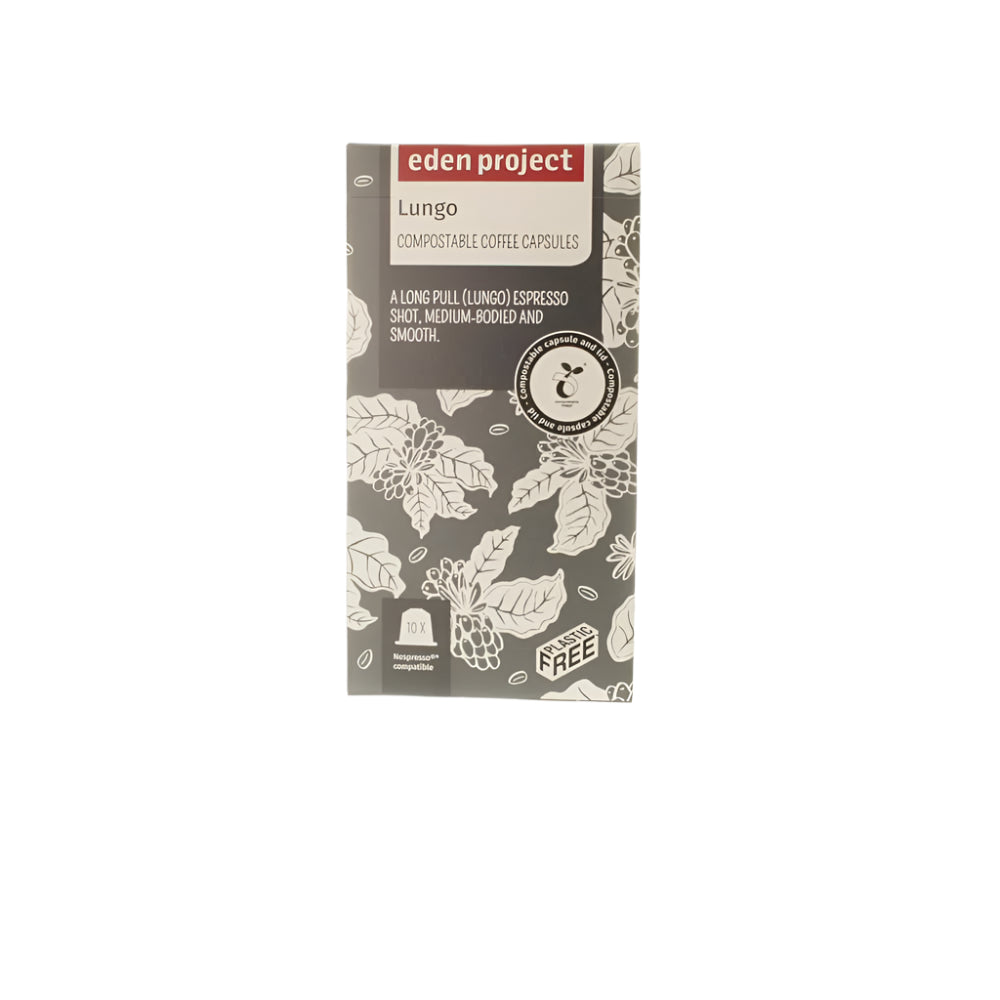 Eden Project Lungo Home compostable Nespresso capsules. Full oxygen protected capsules, which will work in all brands and models of Nespresso machine. These unique capsules will compost in your home domestic compost heap back into Carbon, oxygen, nitrogen and water in 23 weeks. No need to break the capsule apart to recycle it, simply put it in your compost heap or council compost bin. A long pull (Lungo) espresso shot, medium bodied and smooth.
