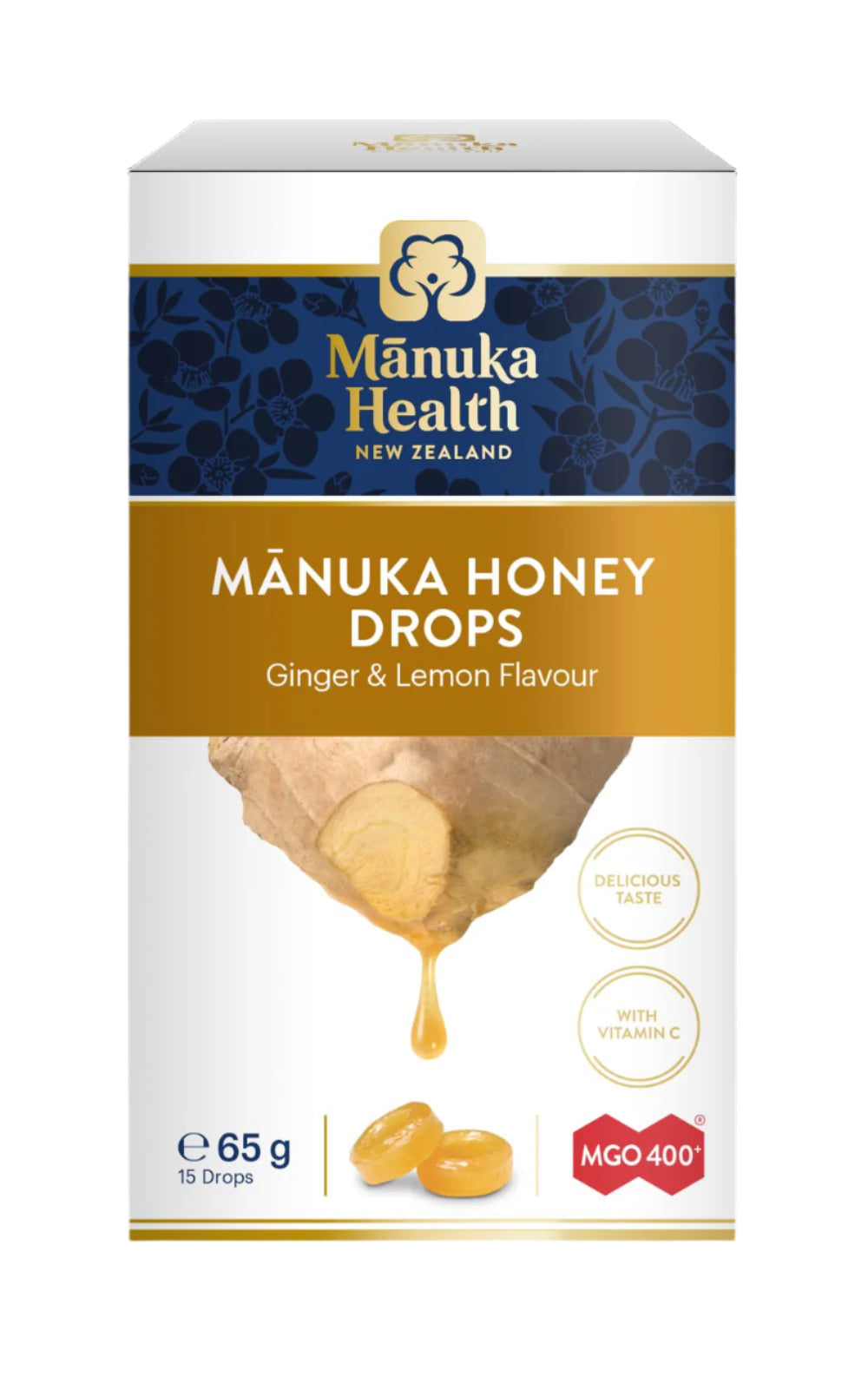 Your guarantee of genuine and premium grade Manuka Honey. The very best of nature and science. Manuka Health's commitment from the very beginning has been to provide premium natural products that combine the very best of nature and science. These delicious soothing drops combine the goodness of premium New Zealand Manuka honey with the fresh natural flavours with the taste of Ginger and Lemon and an extra boost of Vitamin C. Made with our high grade MGO 400+ Manuka Honey, certified for natural methylglyoxal content (400mg/kg). Manuka Health is the No.1 selling Manuka selling brand of New Zealand honey in 25 countries! Manuka Honey is collected from a plant that is unique to New Zealand - Leptospermum scoparium. The white flowers appear in spring and are much loved by the honey bees. Manuka flowers have a strong, aromatic fragrance and are full of the nectar which provides this dark, creamy honey. Methylglyoxal - the unique compound in Manuka Honey MGO Manuka Honey is labelled based on the minimum Methylglyoxal content (mg/kg) it contains. Methylglyoxal is the compound directly responsible for the remarkable properties of Manuka honey and the MGO rating clearly indicates the minimum level of this compound in each jar. No other system of measurement gives such a clear and simple indication. The higher the MGO rating the more Methylglyoxal content. Quality Assurance All of our MGOTM Manuka Honey products are scientifically tested and verified to ensure you are getting consistent quality. Every batch is subjected to laboratory tests that measure various quality parameters including Dietary Methylglyoxal content. Great care is taken to ensure that the Methylglyoxal is maintained from the bee-hive to the finished product so you do not lose any of the valuable properties of this remarkable honey. INGREDIENTS Cane Sugar, Glucose, Manuka Honey (8%, 344mg), Water, Natural Lemon Oil, Natural Ginger Extract, Vitamin C. Serving size: Dissolve 1 lozenge slowly in the mouth and repeat as required up to 5 times daily. Suggesed use: Not to be given to children under 6 years of age. Storage: Please store this product in cool dry conditions. Keep out of reach of young children Not suitable for infants under 12 months.