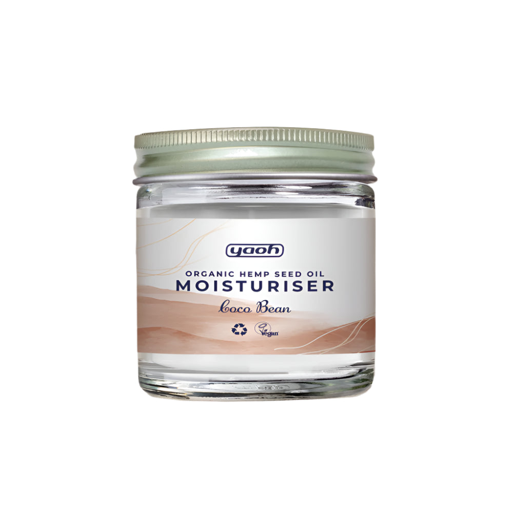 Yaoh Hemp Seed Oil Moisturiser Coco Bean in a glass jar, combines the moisturising and rejuvenating qualities of organic hemp seed oil with extracts of cocoa and vanilla to create an exotic moisturiser that is vegan, free from sodium lauryl sulphate, parabens, harmful substances and unnecessary chemical additives. Not tested on animals.