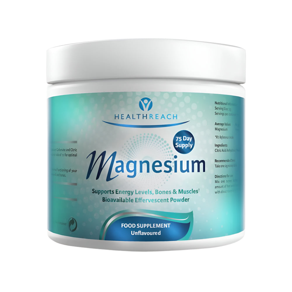Healthreach Magnesium Unflavoured Powder 75 day contains magnesium carbonate and citric acid that form magnesium citrate when mixed with water. Ideal to support energy, muscle health, bones and the nervous system.