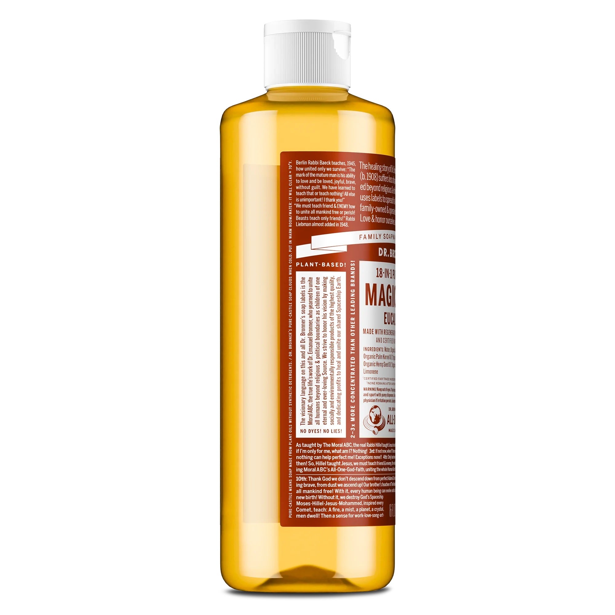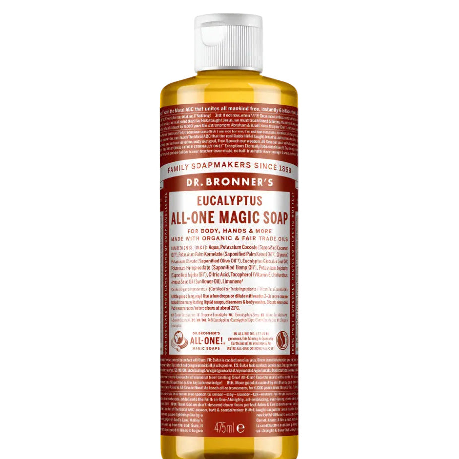 DR Bronners Organic Eucalyptus All-One Magic Soap 475ml Earthy and warm, with a powerful menthol burst to clear congestion and focus the mind! Scented purely with organic eucalyptus oil, our Eucalyptus Pure-Castile Liquid Soap is concentrated, biodegradable, versatile and effective. Good for just about any cleaning task. Face, body, hair food, dishes, laundry, mopping, pets clean your house and body. This product is Natural, Organic, Vegan, Biodegradable and Fairtrade.