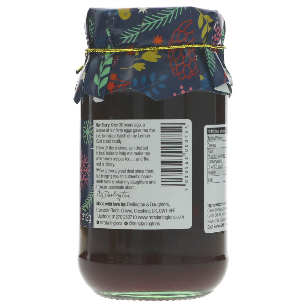 cranberries & apples make the perfect chutney partners. mrs darlington's cook them slowly in traditional open pans with onions sultanas and spices to create a delicious festive chutney perfect for the christmas table. mrs darlington's a small family firm in cheshire have been making their range of unique curds preserves chutneys and sauces for over 35 years. this success story began when marion darlington was faced with a surplus of eggs from the family farm. marion decided to use the eggs to make a small batch of her homemade (and now legendary) lemon curd to sell to local shops. the shelves soon emptied and requests quickly followed asking whether she might consider selling her other homemade jams and chutneys too. so a farm building was converted into a large kitchen and marion asked ladies from her local village to come and help her and the rest is history. the darlington family have come a long way; but still hold the same aim they began with - to bring you high quality products with a truly homemade taste.