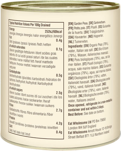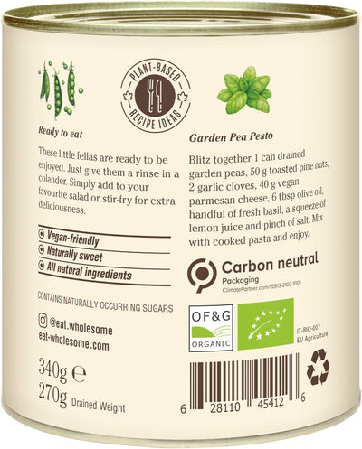 Eat Wholesome Organic In Season Garden Peas are 100% natural, prepared fresh (not dried or frozen) and canned within hours of harvesting. Features: - 100% NATURAL CERTIFIED ORGANIC: Corn, water and Italian sea salt - IN SEASON: Prepared fresh (not dried or frozen) and canned within hours of harvesting - NO ADDED SUGAR: Unsweetened and contains only the natural sweetness of corn - NON-BPA: Fully recyclable, easy open cans with non-BPA lining - VEGAN FRIENDLY: Suitable for vegetarians and vegans