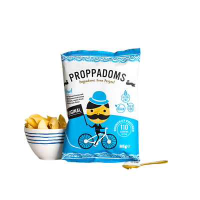 Mini Poppadoms seasoned with flavours around the world, not as unhealthy as you would first think, cold pressed rapeseed oil used to keep things non greasy. Only seasoned Poppadom brand in these flavours in 25g bags on the market