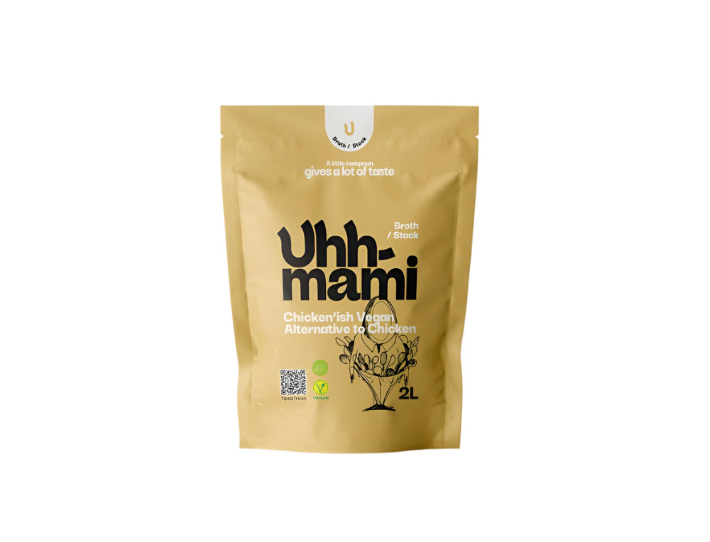 There is something almost relaxing about a good chick- en broth, which thanks to its rounded flavour and nearly caramelised sweetness, can help you settle down and enjoy your food even more. That's the feeling I've tried to recreate with Chicken'ish. When you mix Chicken'ish in hot water, you'll immediately notice the roasted flavours of chicken and chicken skin - without any chicken in the actual product. It is perfect for risotto, as a base in a sauce or with dishes that contain cheese. It also works great in classic mayonnaise salads, such as chicken salad, where you want to boost the flavour of chicken. In fact, it can improve any mayonnaise that needs to be spiced up. Uhhmami is an award winning brand, created by Danish Michelin Chef Frank Lantz. he wanted to create a foundation for all meals in a plant-based future, without compromising on taste and quality. all products are clean label and organic. use a teaspoon to a cup of boiling water, or add directly to any dish that needs an extra boost. In a fun way, Uhhmami is the missing link that brings together the flavor in all recipes