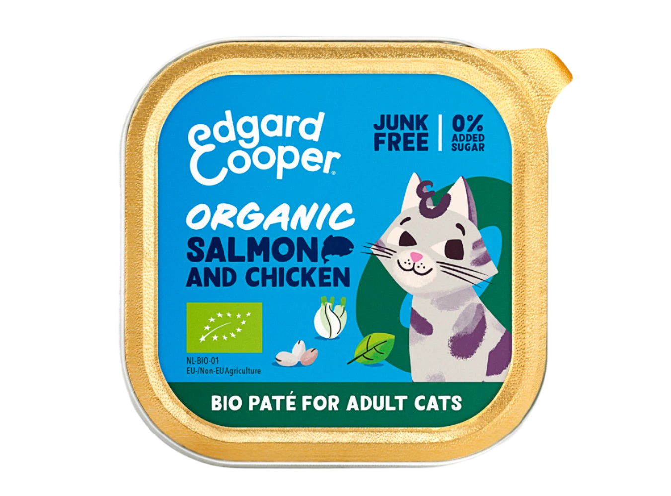 Edgard Cooper Organic Salmon and Organic Chicken with chia seeds, basil and fennel. Junk free, 0% added sugar, Lots of fresh meat nutritious offal Produced from 100% controlled organic farming. Grain-free recipe, Suited for sterilised/neutered cats EDGARD COOPER'S VALUES: JOYFUL FOOD: Our naturally, tasty recipes are packed with lots of fresh meat and healthy ingredients, cooked with care to preserve taste and nutrients PLAY NICE WITH NATURE: From our paper-based packaging, to our commitment to achieve Zero Carbon by 2025, we're on a mission to be the world's most sustainable pet brand 03 FRIENDS STICK TOGETHER : We donate 1% of our sales to our Independent foundation to end the suffering of dogs and cats worldwide. EDGARD COOPER'S VALUES: 01 JOYFUL FOOD: Our naturally, tasty recipes are packed with lots of fresh meat and healthy ingredients, cooked with care to preserve taste and nutrients 02 PLAY NICE WITH NATURE: From our paper-based packaging, to our commitment to achieve Zero Carbon by 2025, we're on a mission to be the world's most sustainable pet brand 03 FRIENDS STICK TOGETHER : We donate 1% of our sales to our INDEPENDENT FOUNDATION to end the suffering of dogs and cats worldwide.