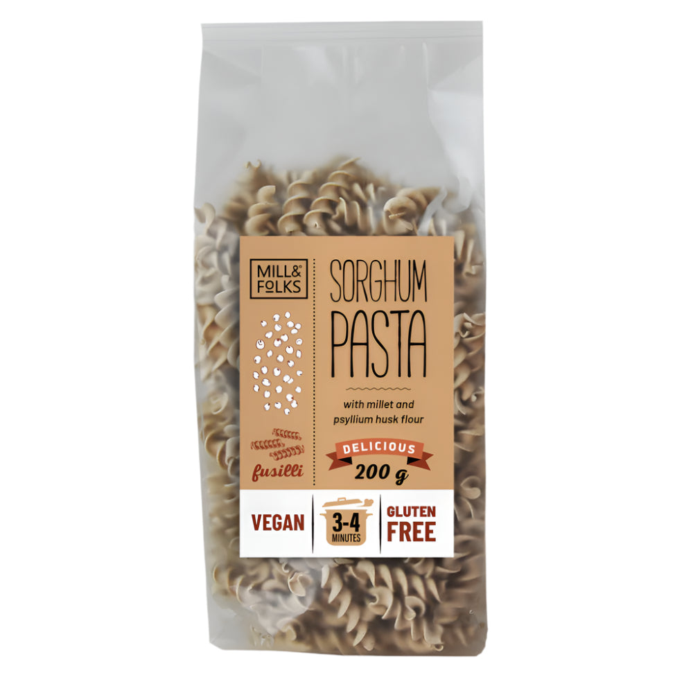 Sorghum pasta fusilli 200g Discover the Delight of Mill Folks Sorghum Pasta! Indulge in the rich, savory flavors of our gluten-free Mill Folks fusilli, expertly crafted from a high-quality blend of sorghum and millet flour. This irresistibly tasty pasta delivers a smooth, velvety texture that holds up beautifully after cooking, making each bite satisfying and delicious. Elevate your meals with Mill Folks Sorghum Pasta-where bold taste meets wholesome nutrition in every flavorful forkful! Ingredients: sorghum flour (57%), millet flour, water, psyllium husk flour Suggestion: Cook in boiling water, on low heat for 3-4 minutes. If ready filter and rinse with plenty of water. Serve according to your taste. Enjoy your meal! Average nutritional value per 100 g of product Energy: 1573 kJ / 372 kcal Fat: 3 g -of which saturated fatty acids: 0,5 g Carbohydrate: 72 g -of which sugars:0,4 g Fibre: 7,4g Protein: 10 g Salt: 0,01 g Made in a gluten-free plant. Allergen information: the product is made in a plant that also processes nuts Country of origin: Hungary Storage: in a dry, cool place, protected from sunlight.