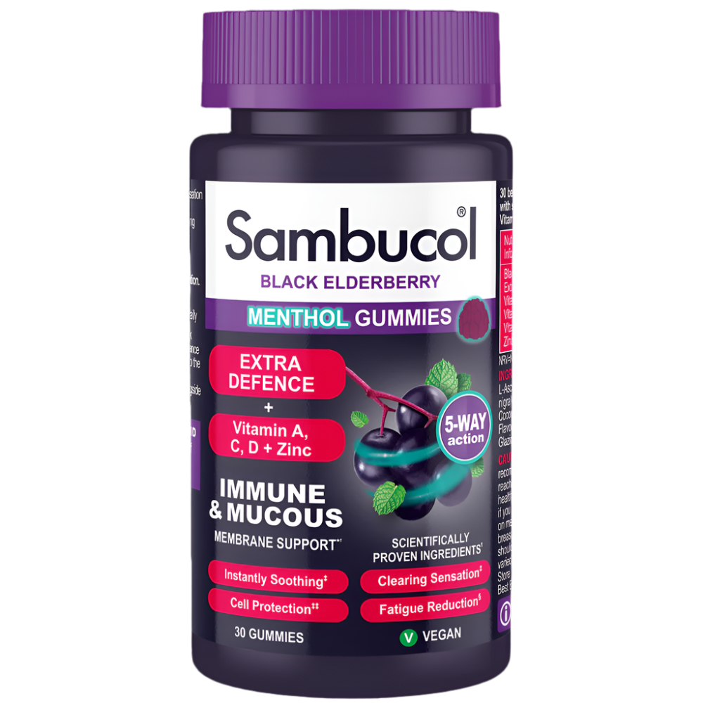 Free from artificial colours and suitable for vegetarians and vegans, these delicious, non-drowsy gummies combine a unique Black Elderberry extract and Vitamin C for all-year- round immune support. Black Elderberries have been used for centuries as a traditional remedy. Sambucol Black Elderberries provide a natural mode of action called AntiVirin. The preparation method of the berries in Sambucol preserves and maximises the naturally occurring health benefits of the Black Elderberry. Sambucol Menthol Gummies deliver an instant soothing and clearing sensation from the vaporising menthol action. Whilst supporting your immune system and menthol membranes, including the lining of your throat and airways. Key facts: - Great tasting gummies - Easy to chew and swallow - Suitable from 12 years+ - Antivirin action - High antioxidant levels - Contains no artificial colours - Suitable for vegetarians vegans - Non-drowsy - Scientifically tested - Gluten free