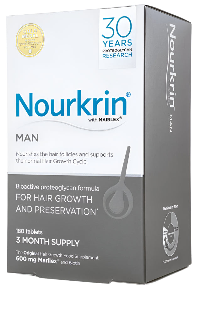 The small, easily swallowed Nourkrin MAN tablets contain the unique active ingredient Marilex , a proprietary marine extract. Nourkrin MAN is fortified with Fenugreek and Omega 3 Fatty Acids to improve the condition of hair follicles in men. Now available in a 180 tablet box for a 3 month supply.