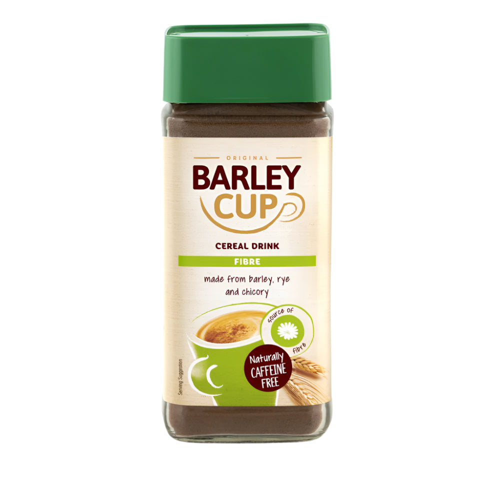 "Barleycup with fibre. Instant cereal drink with fibre With its deliciously mild coffee taste, Barleycup is a drink to enjoy everyday! Made from roasted barley, rye and chicory, Barleycup naturally contains no caffeine. This beverage contains an additional dose of fibre in the form of inulin from chicory root."
