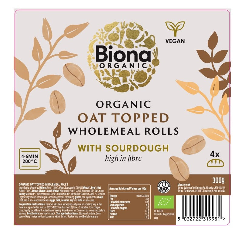 Biona | Organic Oat Topped Wholemeal Rolls (made with sourdough) 300g | 300g