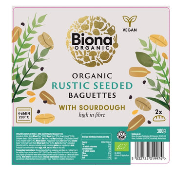 We are excited to introduce Biona's newest addition: a twin pack of rustic seeded sourdough baguettes. This seeded baguette combines sourdough with a mix of seeds, for added nutrition. Enjoy freshly baked baguettes in just 4-6 minutes. Simply pop them in the oven to prepare.