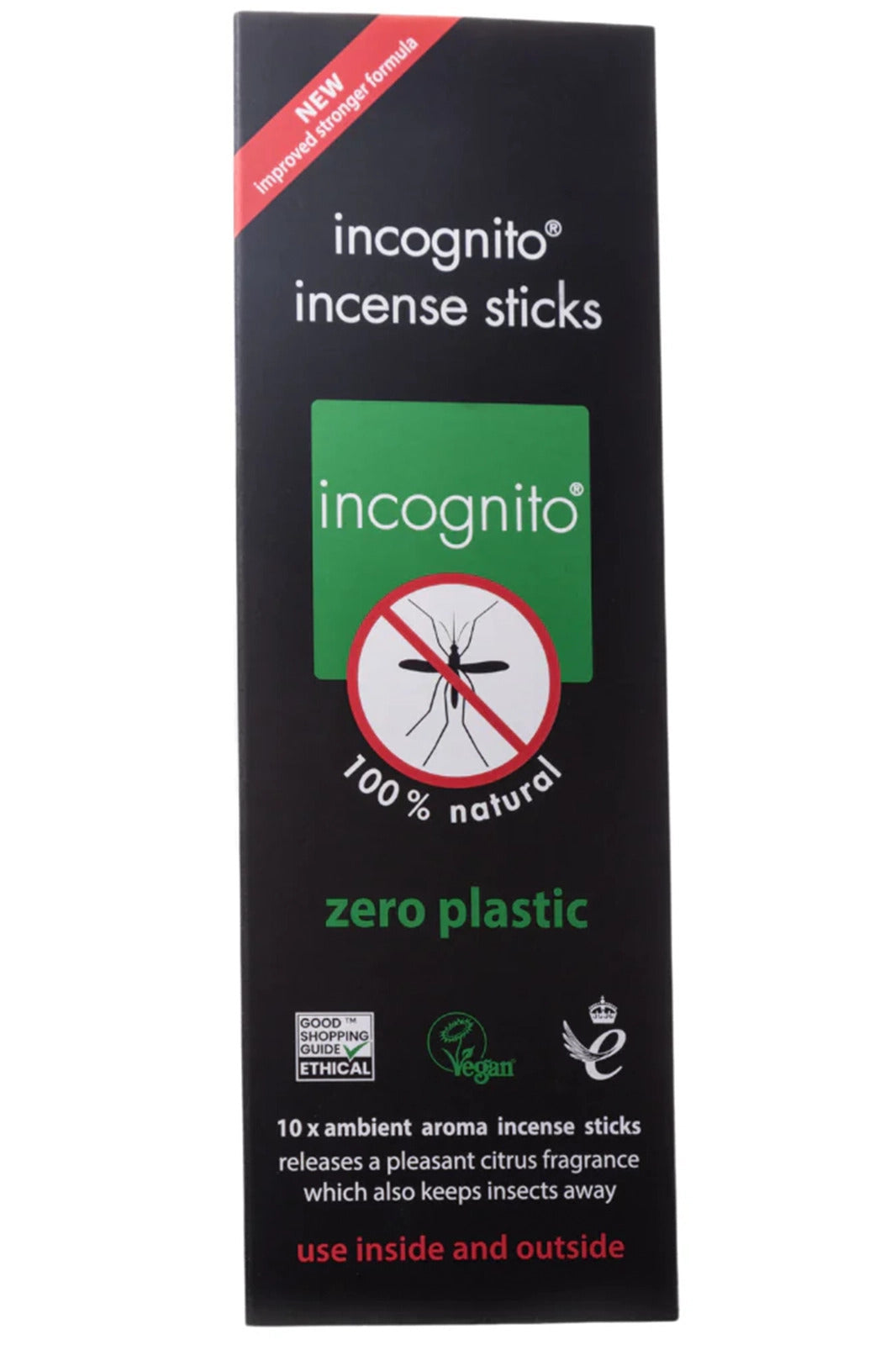 incognito citronella incense sticks are a fantastic non-invasive way to protect you and those around you from mosquitoes and all small insects. This incense is a very effective, chemical free, non-toxic mosquito shield which you can burn in or out doors. It has a completely natural fragrance and emits strong refreshing notes to keep the majority of insects away. Each stick will last for approximately 1 hour.