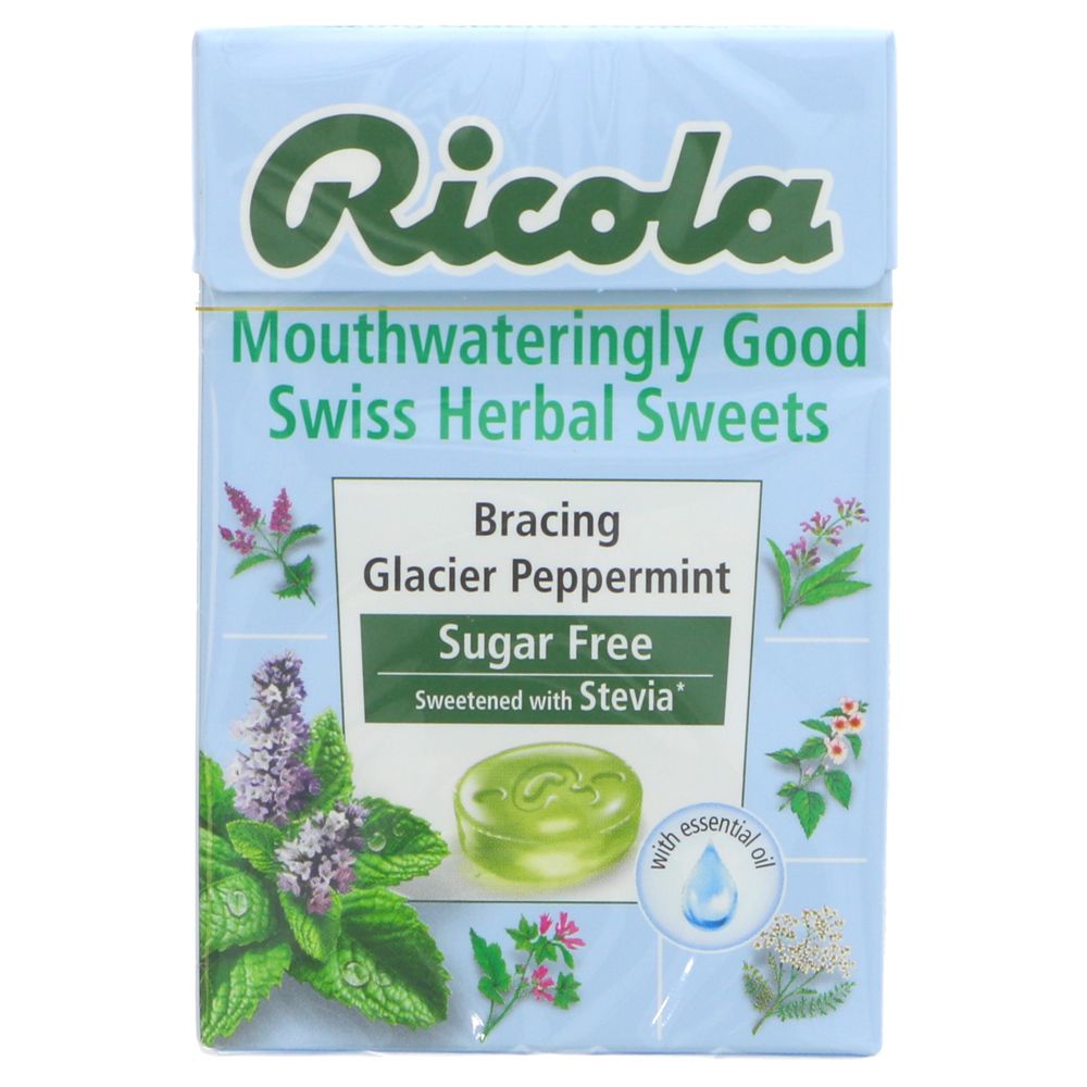 Experience the refreshing taste of Glacier Peppermint with Ricola's sugar-free & stevia sweetened mints. Perfect for those who want a guilt-free treat, these mints are gluten-free & vegan. Enjoy them anytime, anywhere as a quick pick-me-up or after a meal.