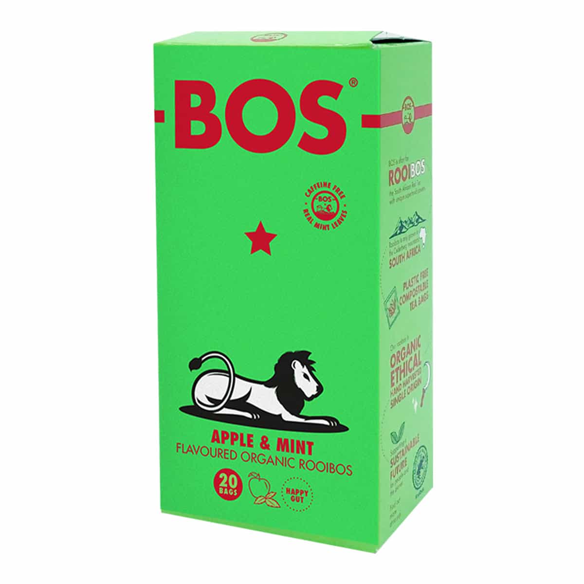 Indulge in the refreshing blend of Rooibos, Apple & Mint by Bos. This Fairtrade, Gluten Free, Organic, and Vegan tea is naturally caffeine-free, packed with antioxidants, and low in sugar. Savor the invigorating flavors and enjoy a guilt-free sip.