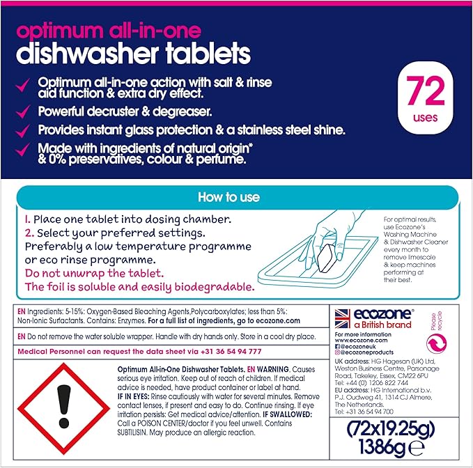 Ecozone's Dishwasher Tablets Optimum 72s are vegan & All In One for a convenient cleaning experience. Keep your dishes sparkling with this eco-friendly solution.