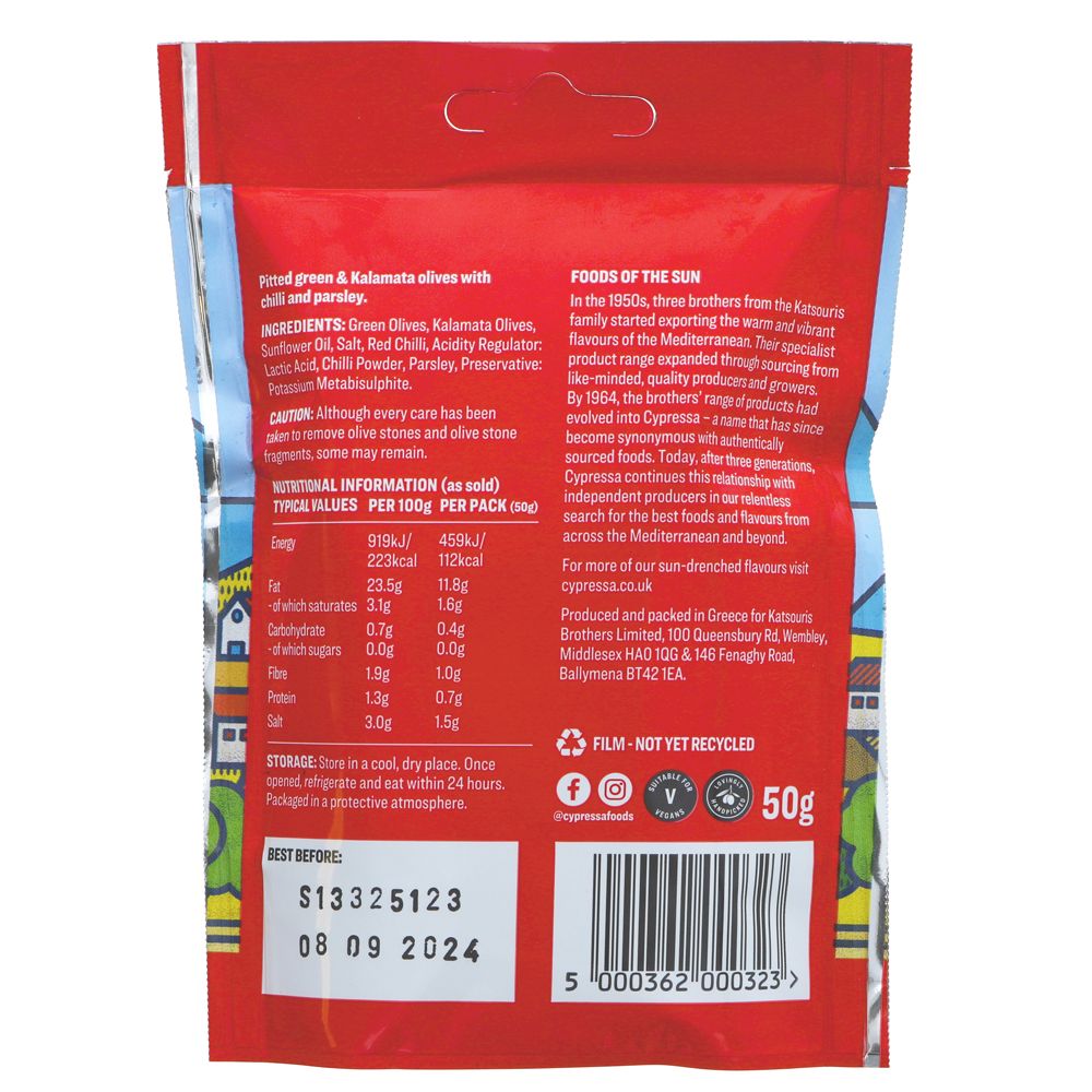 Indulge in the bold flavours of Greek olives with a spicy kick in this Cypressa Chilli Pouch. Perfect for snacking or adding a zesty twist to your favourite dishes. Vegan-friendly & bursting with Mediterranean goodness.